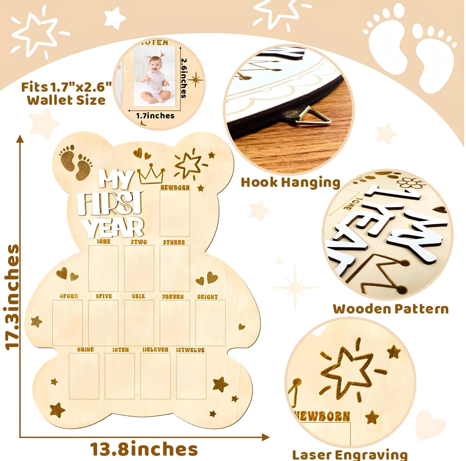 Celebrate baby's precious first year with this beautiful wooden photo display board. Designed to showcase monthly milestone pictures from 1 to 12 months, this handcrafted wooden frame serves as both a charming nursery decoration and a cherished keepsake. Perfect for baby showers, first birthday parties, or as a heartfelt gift, it also doubles as a lovely photo prop and party backdrop. Capture every special moment in a timeless, natural wood style.