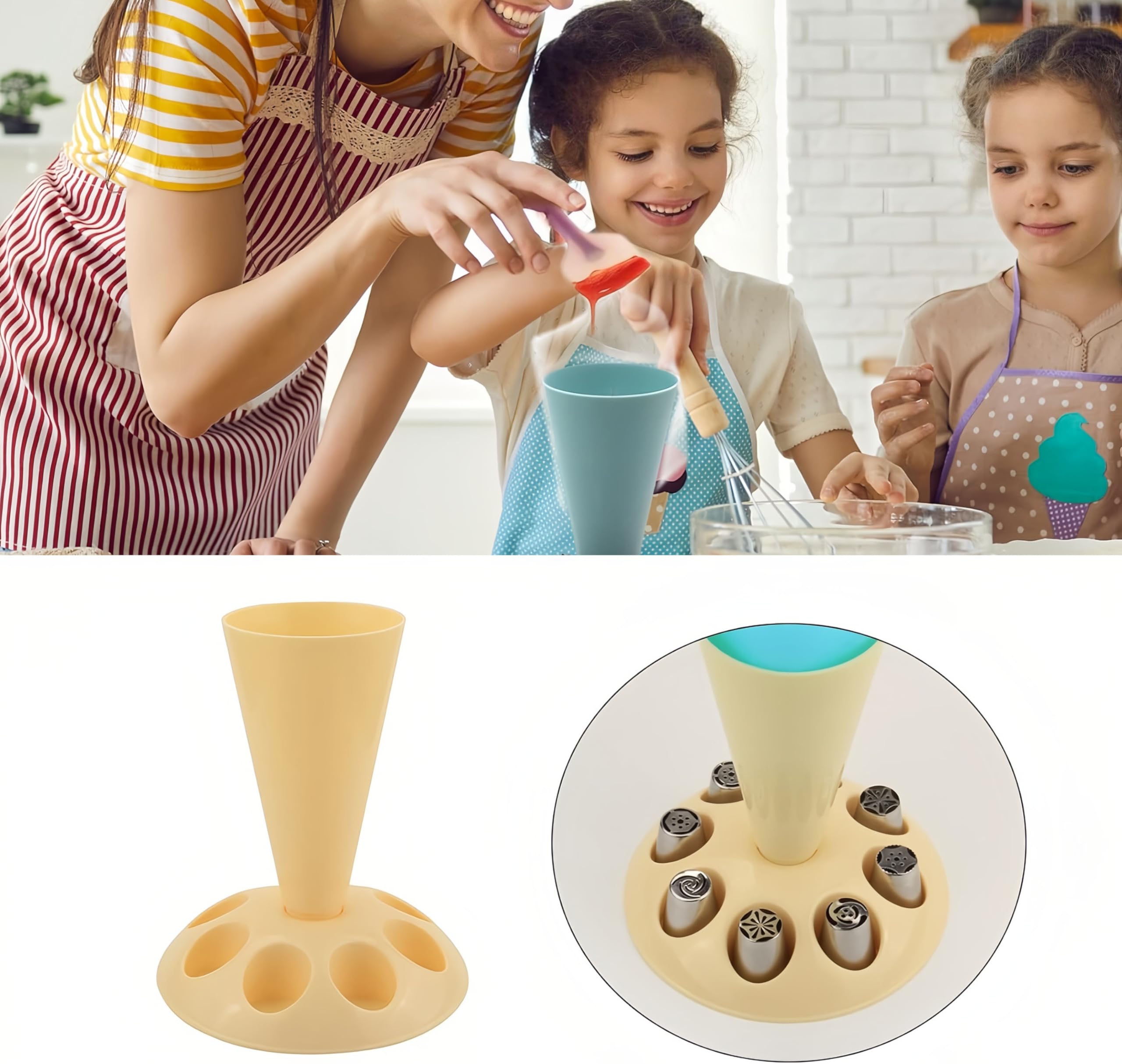 Keep your cake decorating organized and efficient with this versatile piping bag stand. Featuring a wide 7.5-inch diameter base for enhanced stability and eight surrounding holes to neatly store icing nozzles, this stand holds one pastry bag securely while you work. Made from smooth, recyclable ABS material with a removable base for easy cleaning, it’s ideal for beginners, professional chefs, and culinary students—perfect for exams, home baking, and keeping your countertop clean.