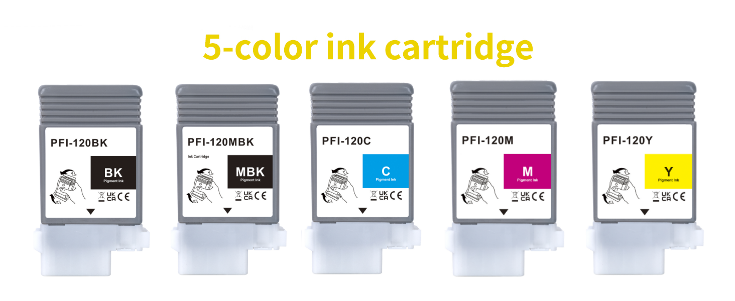 The Package Contains: PFI-120 Pigment Ink Tank 5-Pack (Matte Black, Black, Cyan, Magenta, Yellow) PFI-120MBK PFI-120BK PFI-120C PFI-120M PFI-120Y each with a capacity of 130 ml