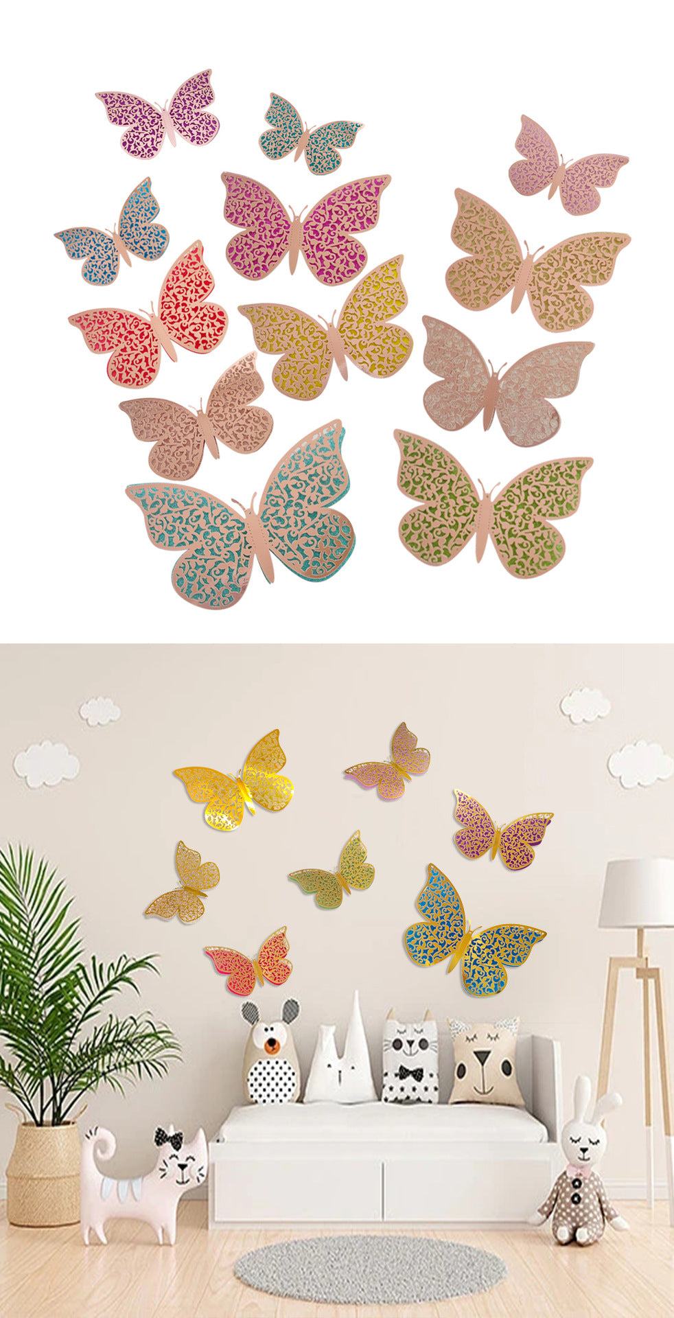 The Package Contains & Premium Features: This set features vibrant double-layer rainbow 3D butterfly wall decals with an intricate hollow-out design. Each butterfly displays a spectrum of joyful colors in a dimensional, layered form, creating a lively and festive visual effect. Perfect for infusing spaces with energy and celebratory charm.