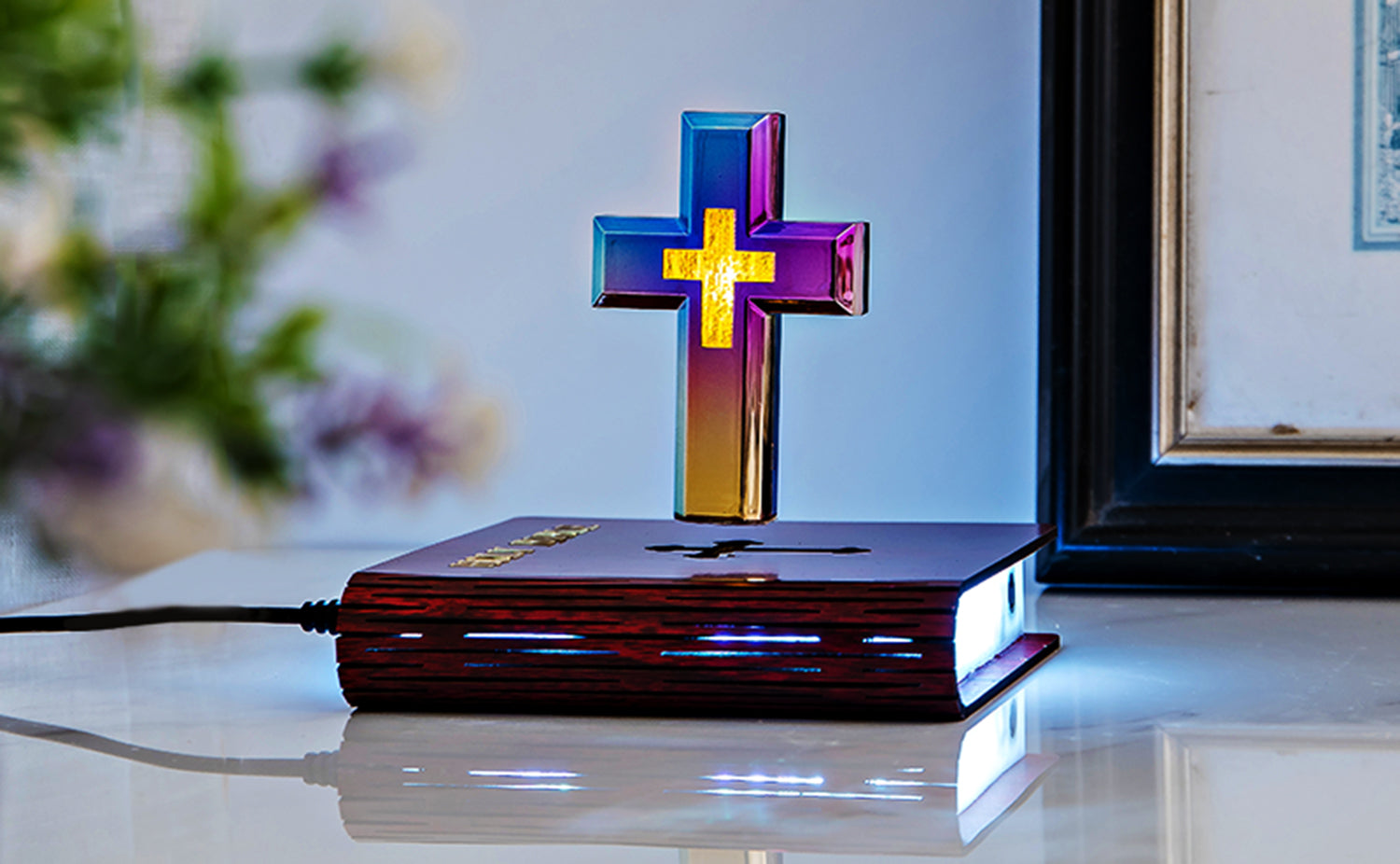 Why You’ll Love This Floating Cross: ✝️ Magical Magnetic Rotation – Cross floats and turns smoothly above the base 💡 7 Adjustable Light Modes – Change colors and brightness to match your mood 📖 Elegant Spiritual Design – Features Bible-inspired base as a symbol of faith 🎁 Meaningful & Thoughtful Gift – Perfect for believers, family, and friends 🏠 Versatile Sacred Decor – Ideal for home, church, office, or meditation space