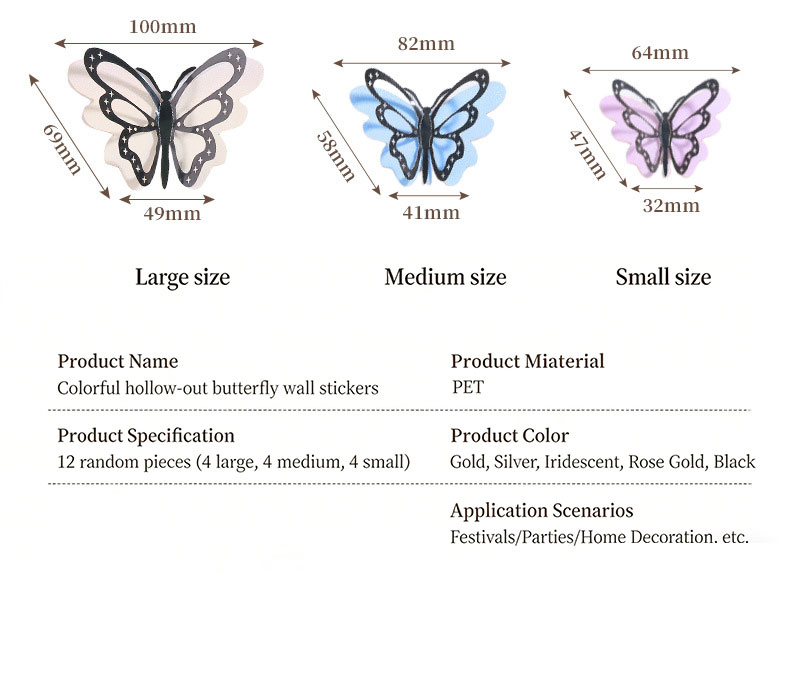 Crafted from premium, lightweight paper with a durable metallic coating, these butterflies are self-adhesive, fade-resistant, and easy to reposition, leaving no sticky residue on walls, furniture, or fondant. They adhere securely to smooth surfaces like glass, tiles, painted walls, and cake frosting, making them perfect for living rooms, bedrooms, weddings, birthdays, or any occasion that deserves a pop of color. With 12 pieces per pack—4 large, 4 medium, and 4 small butterflies—and 5 stunning color combinations including Gold, Silver, Holographic, Rose Gold, and Black paired with 6 vibrant base colors, they offer endless creative possibilities.